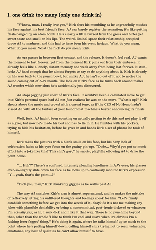 Kirk is a star student, he’s a popular guy with money and pretty eyelashes and Scout’s honor, he’s a good boy who just so happens to have a drinking problem, which has to be the reason why he of all people is the only one willing to spend any amount of time around someone as disgusting and pitiful and amazingly intolerable as AJ.